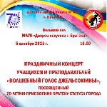 5 декабря 2025 года на Большой сцене Дворца Искусств города Братска состоялся праздничный концерт «Волшебный голос Джельсомины» учащихся и преподавателей ДШИ N 1. Это был настоящий творческий подарок Детской школы искусств к 70-летию родного и любимого города Братска. В основе яркого театрализованного концерта – увлекательное путешествие главной героини, Джельсомины, по миру искусства. Вместе со зрителями она открыла для себя все творческие направления, на которых обучаются дети в школе ... »»»